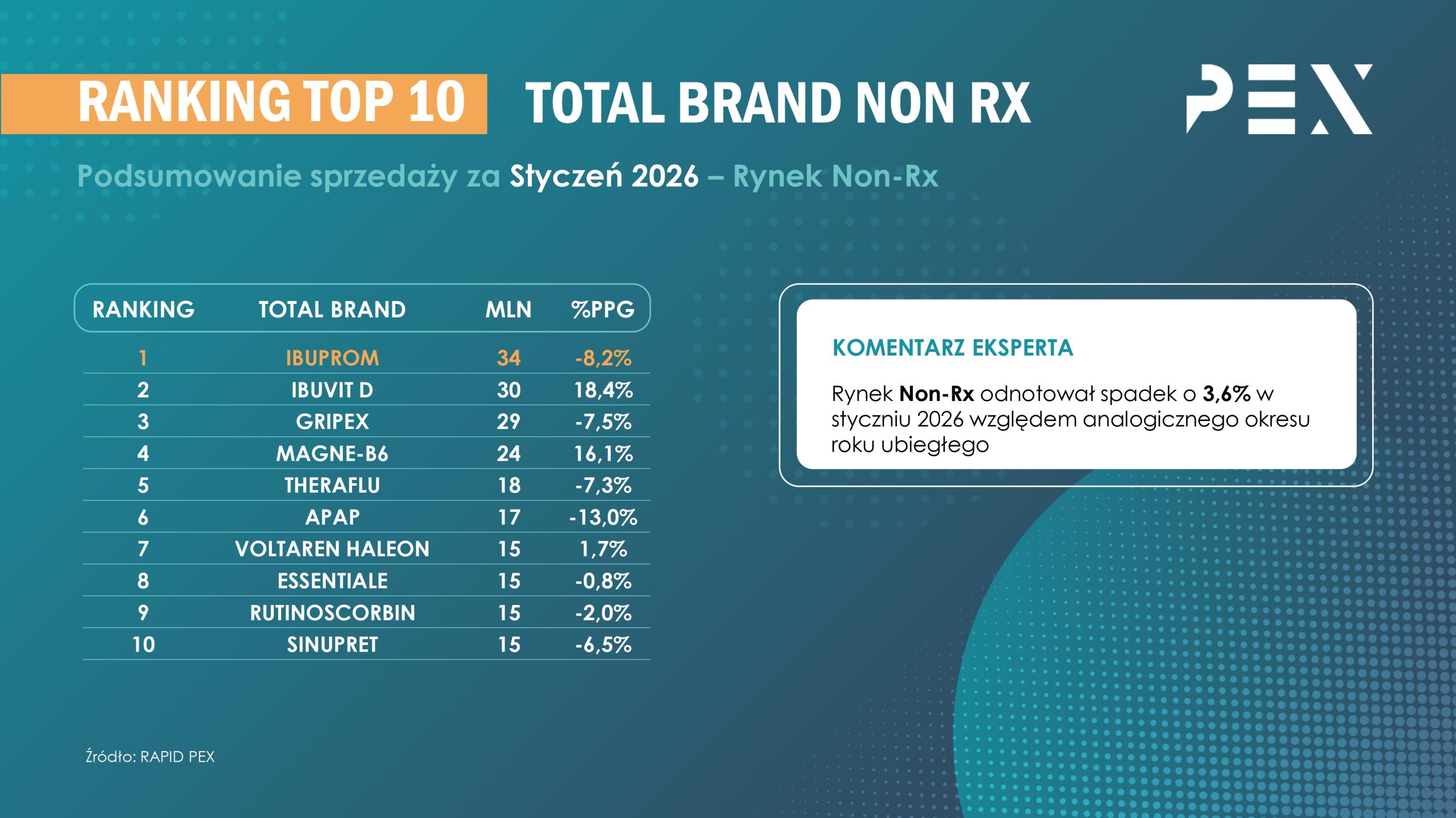 RAPORTY SPECJALNE Ranking TOP 10 TOTAL BRAND Non-Rx Marzec 2026 07.04.2026 Obwieszczenie Ministra Zdrowia Kwiecień 2026 19.03.2026 Ranking TOP 10 TOTAL BRAND Non-Rx Luty 2026 04.03.2026 Ranking TOP 10 TOTAL BRAND Non-Rx Styczeń 2026 05.02.2026 Poprzednia Następna